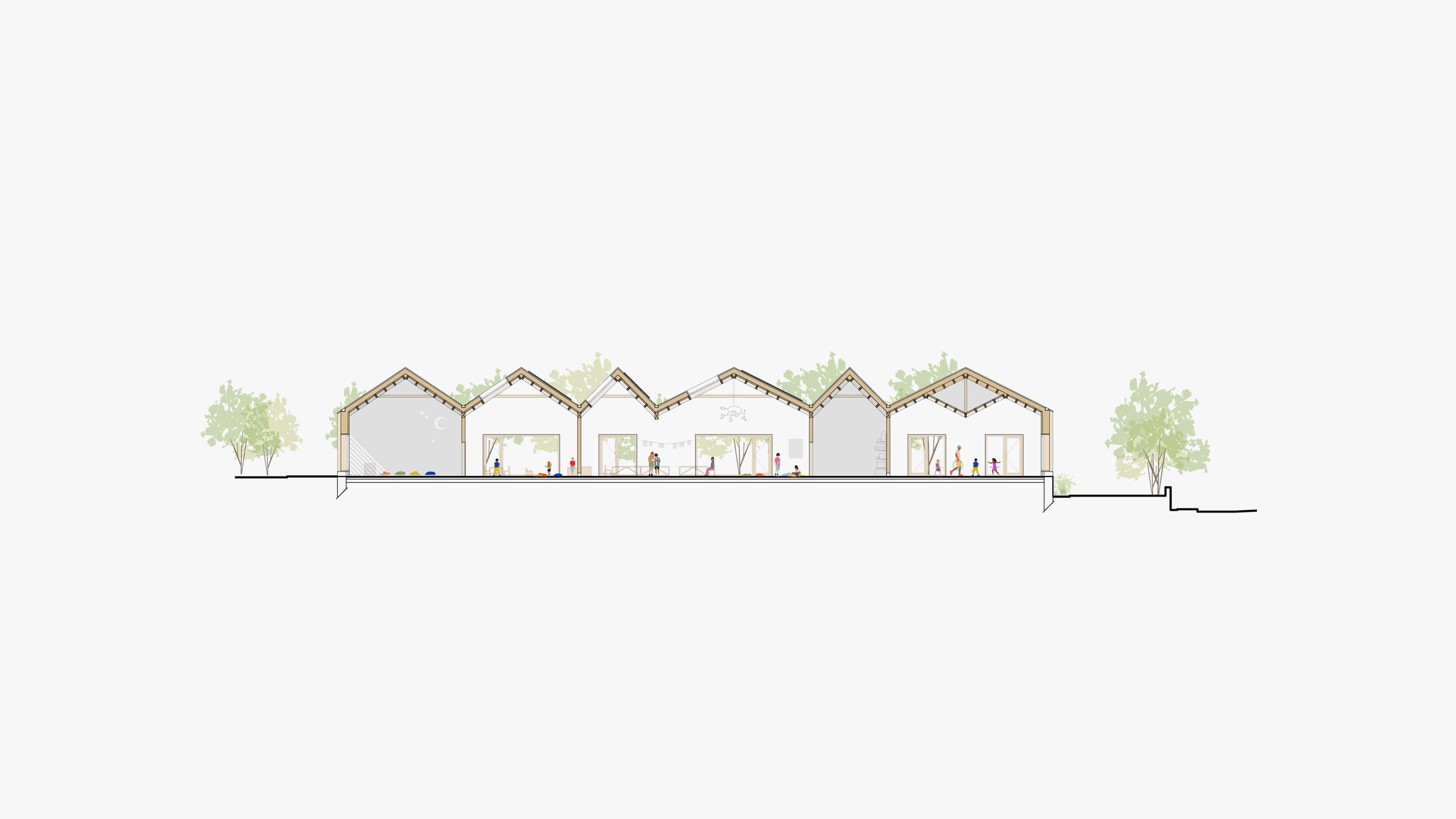 Sa toiture à pans multiples favorise une intégration douce dans le tissu urbain et crée des volumes intérieurs généreux, conférant au lieu une atmosphère domestique, chaleureuse et adaptée aux enfants. Le bâtiment comprend trois grandes salles d’activités et deux dortoirs polyvalents, tous orientés à l’Est, vers les cours et les espaces éducatifs. Une circulation centrale, large et baignée de lumière naturelle, fait également office d’espace de vie à part entière.